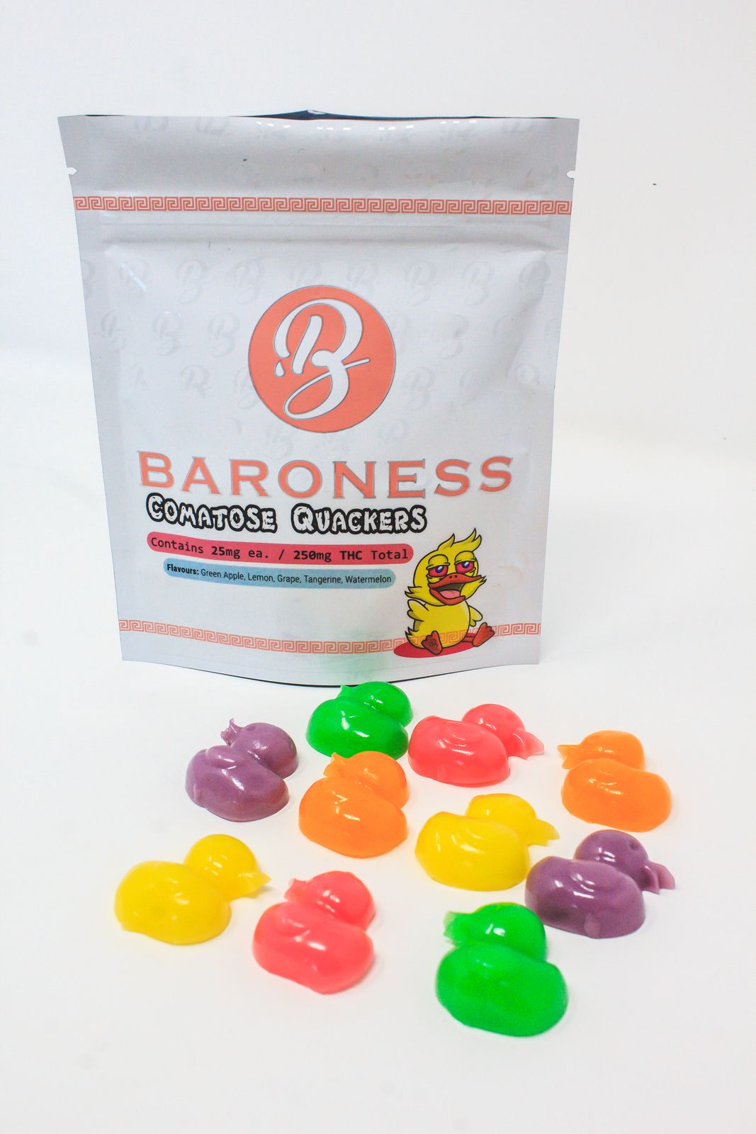 BARONESS Comatose Quackers THC Gummies give you 10 gummies per pack, with each gummy having 25 mg of THC. They might not give you a huge high, but go low and slow if you are a beginner.