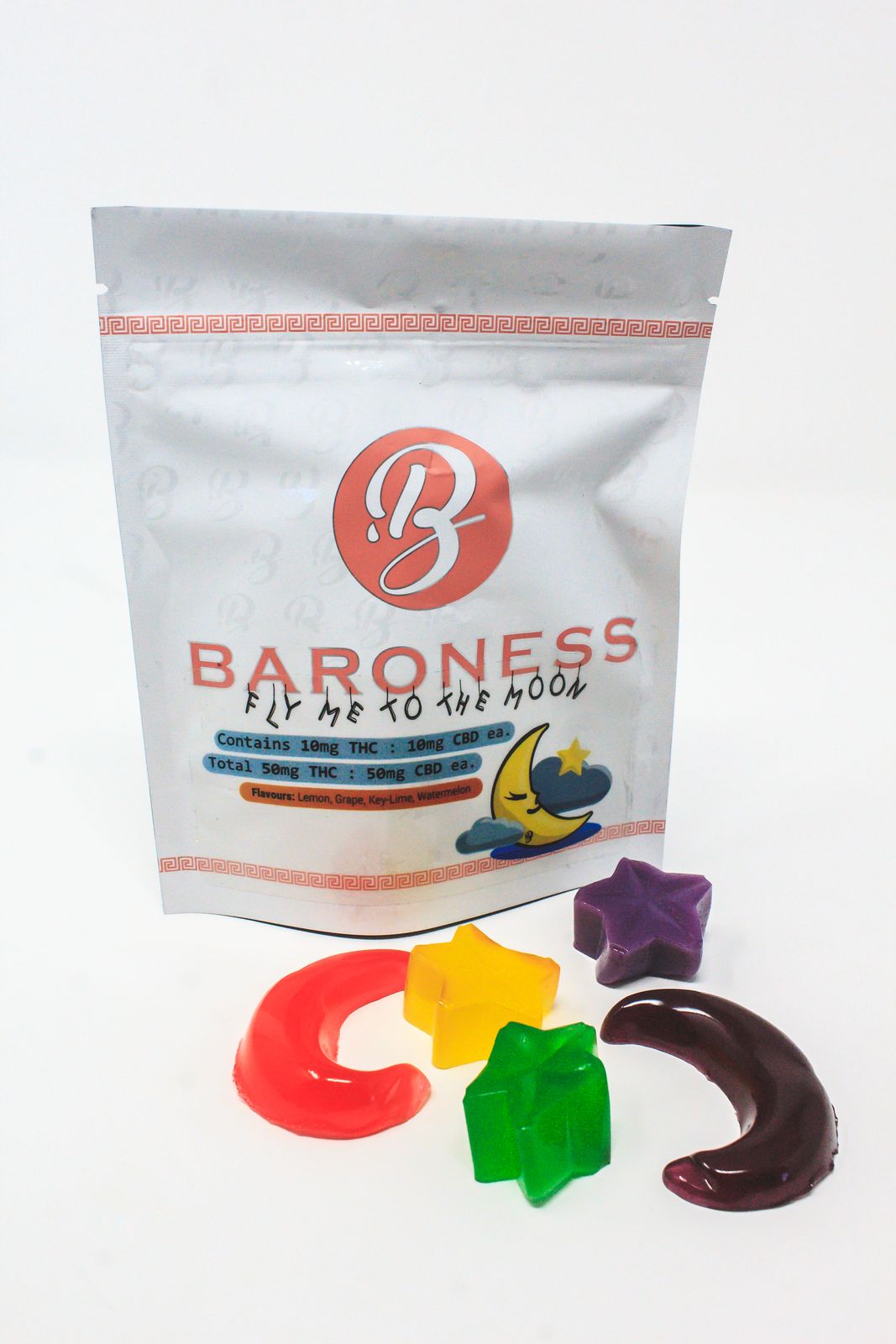 The BARONESS Fly Me To The Moon Gummies (THC/CBD) have the perfect combination of THC and CBD for a mild and relaxing buzz and relief from pain with great sleep.