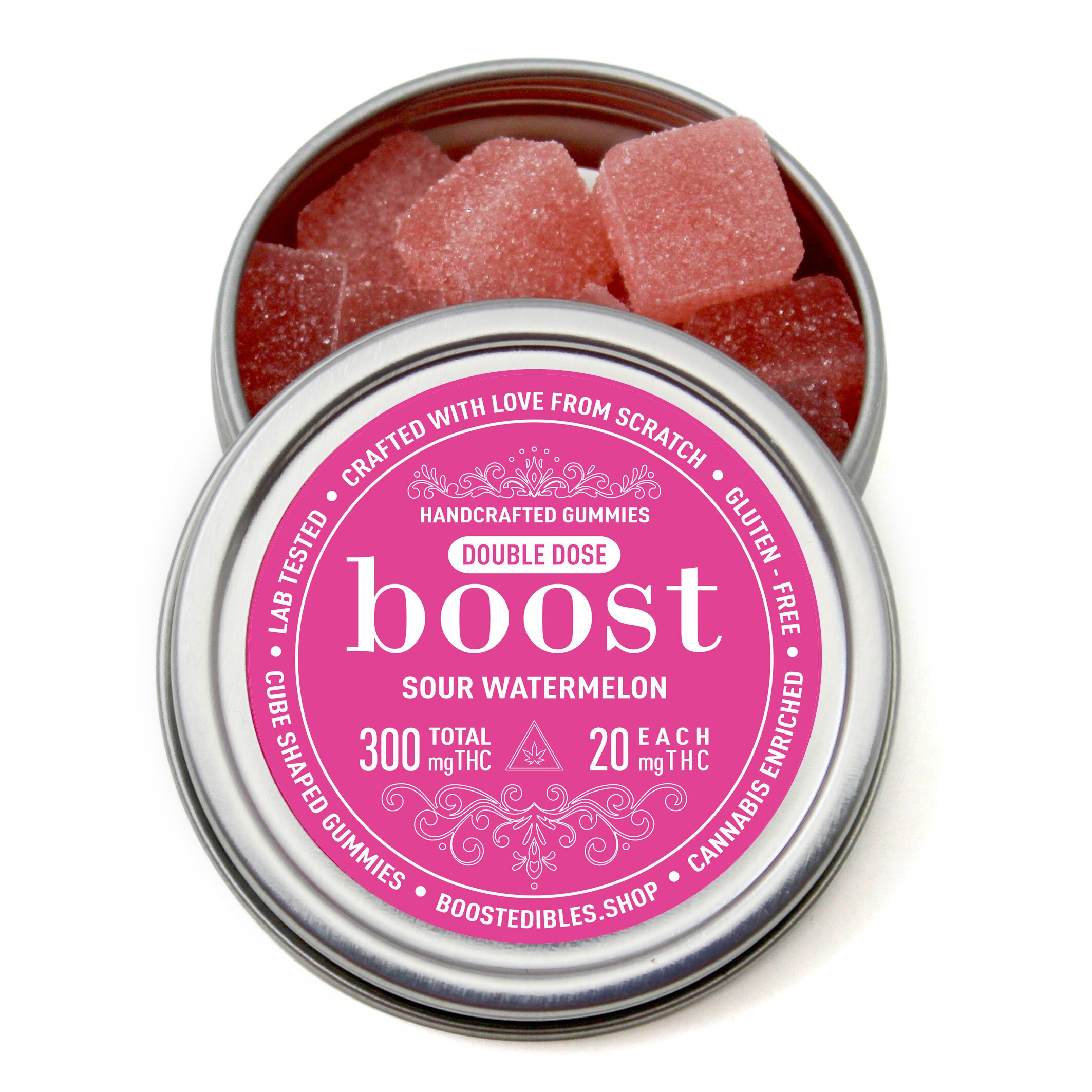 Wake up your tastebuds with the Boost Sour Watermelon gummies! This mouth-wateringly tart option is another alternative for all the sour candy lovers out there! These Sour Watermelon gummies are made using Ascorbic Acid, Citric acid, colour, gelatine, glucose syrup, MCT oil, sugar, sunflower lecithin, THC distillate.