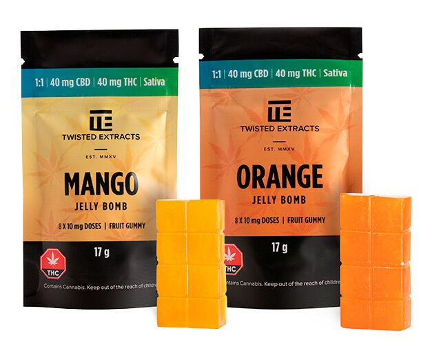 - Each Jelly Bomb is infused with 40 mg of THC derived from a sativa dominant cannabis strain, and 40 mg of CBD (8 x 5mg CBD + 5mg THC servings each).