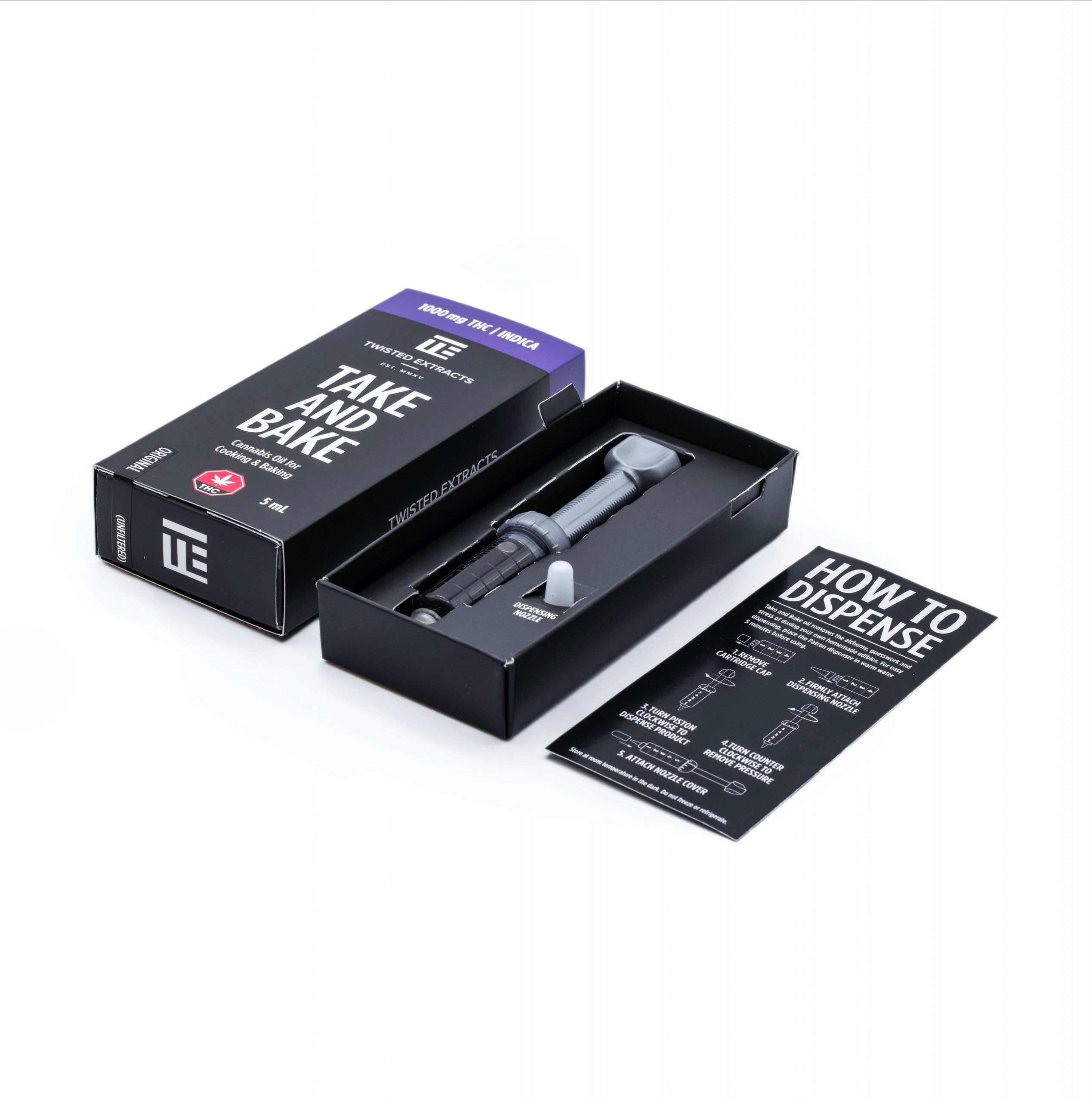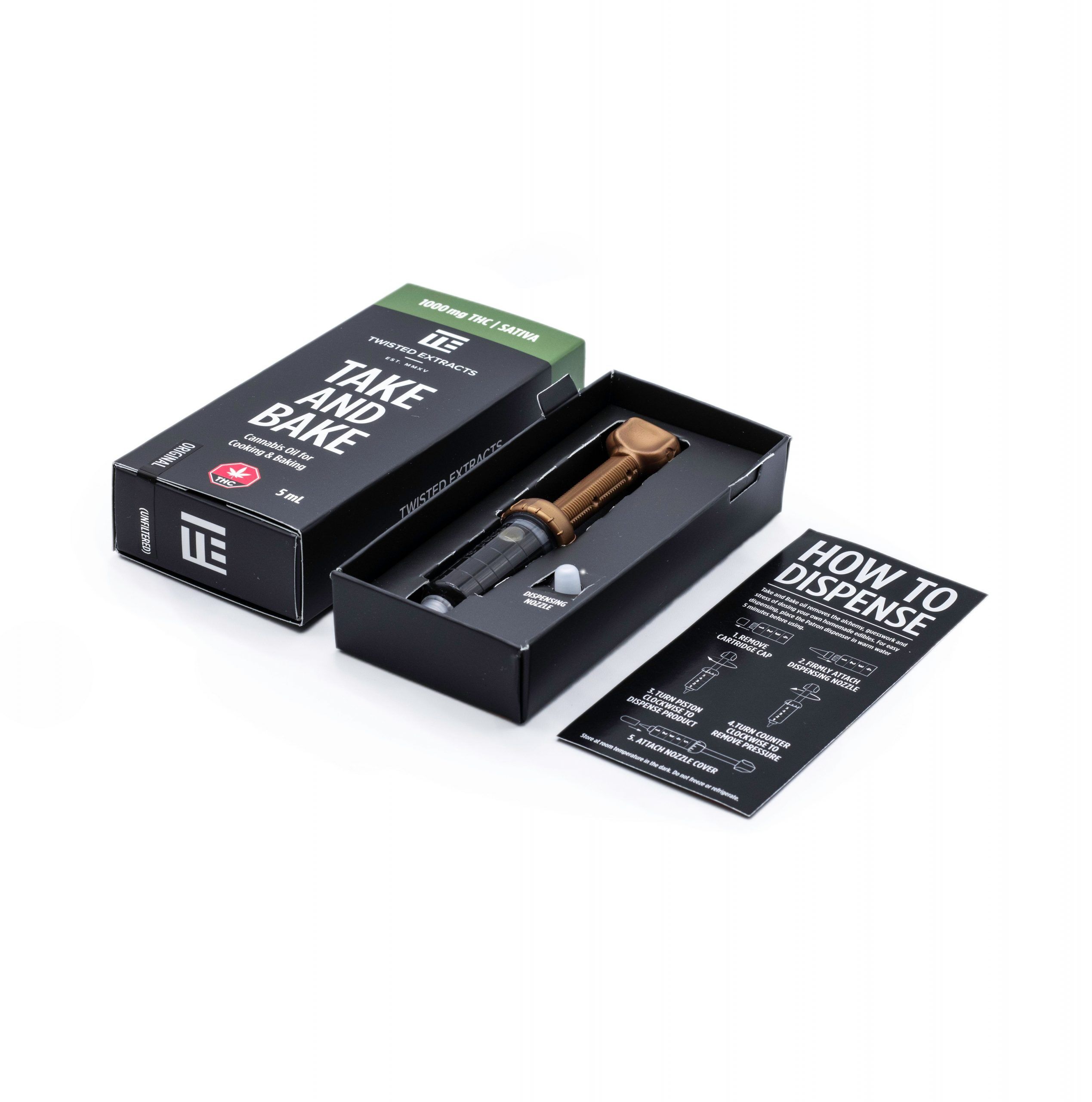 Cannabis oil in a precise dispenser, perfect for your cooking and baking needs. Made with the same cannabis oil used to infuse all Twisted Extracts Jelly Bombs, Cara-Melts, and Oil Drops so you can make your own TE edibles at home. Dispense Take and Bake Oil in 2 mg THC increments easily, accurately and with no mess. Original Take and Bake Oil is the same oil used to infuse all of Twisted Extracts products. It has a stronger cannabis taste compared to the Filtered Take and Bake Oil.